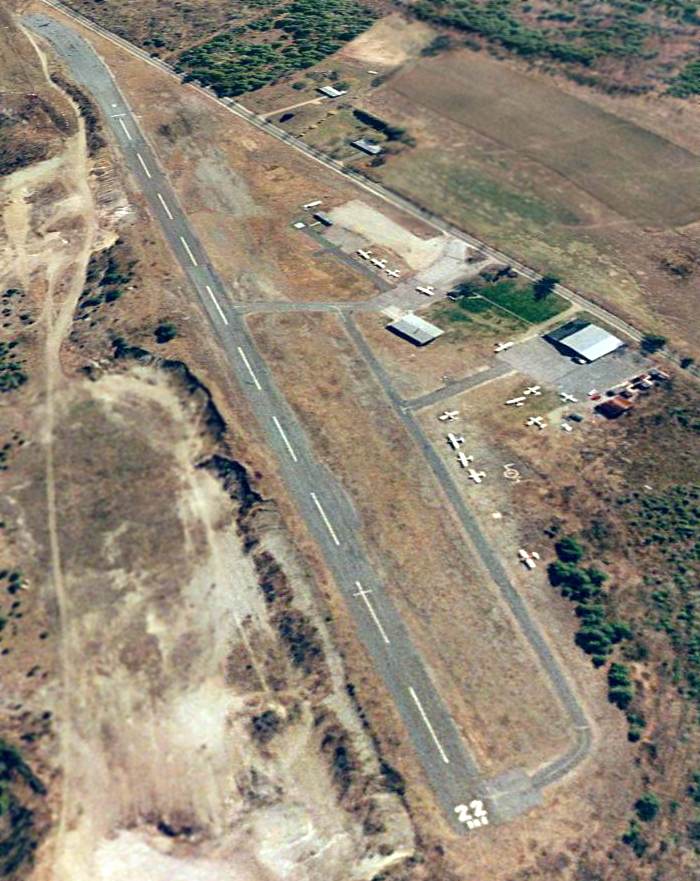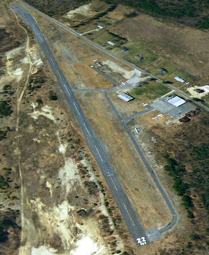 with a few small buildings & 5 light aircraft (including 1 twin-engine) along the west side.