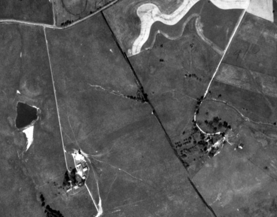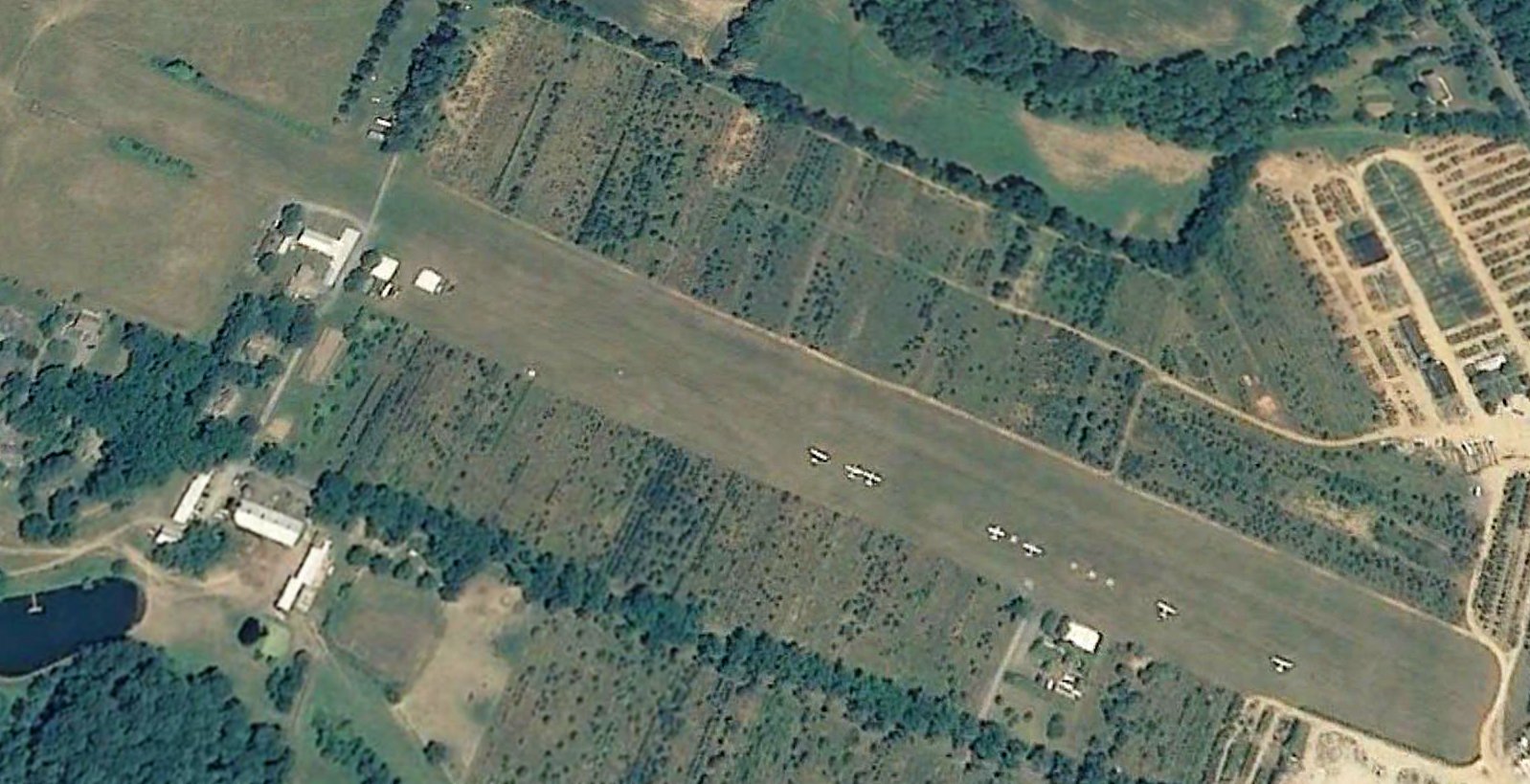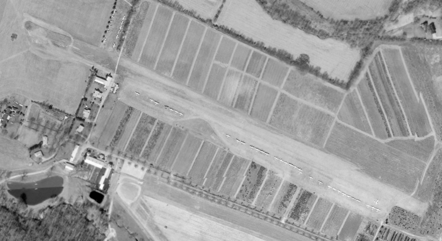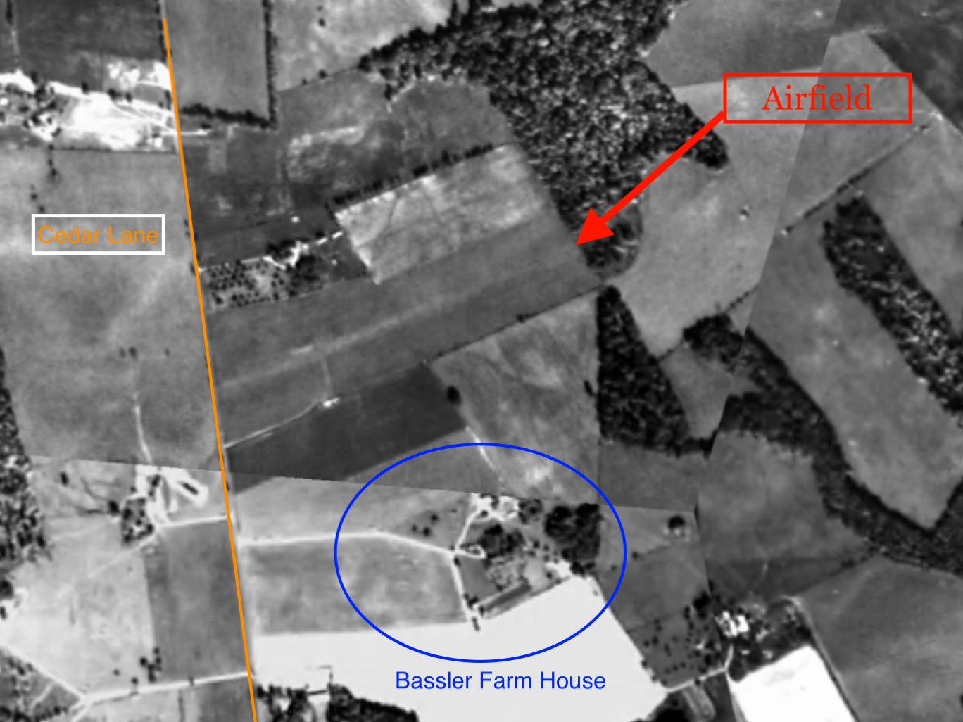 A 1960 aerial photo (courtesy of Susan Kain via Jim Blanchard) looking east/southeast at the Bassler Farm, with Alfred Bassler's 1st plane (a Piper J-4) parked halfway down the "driveway" from what is Cedar Lane to the farmstead.