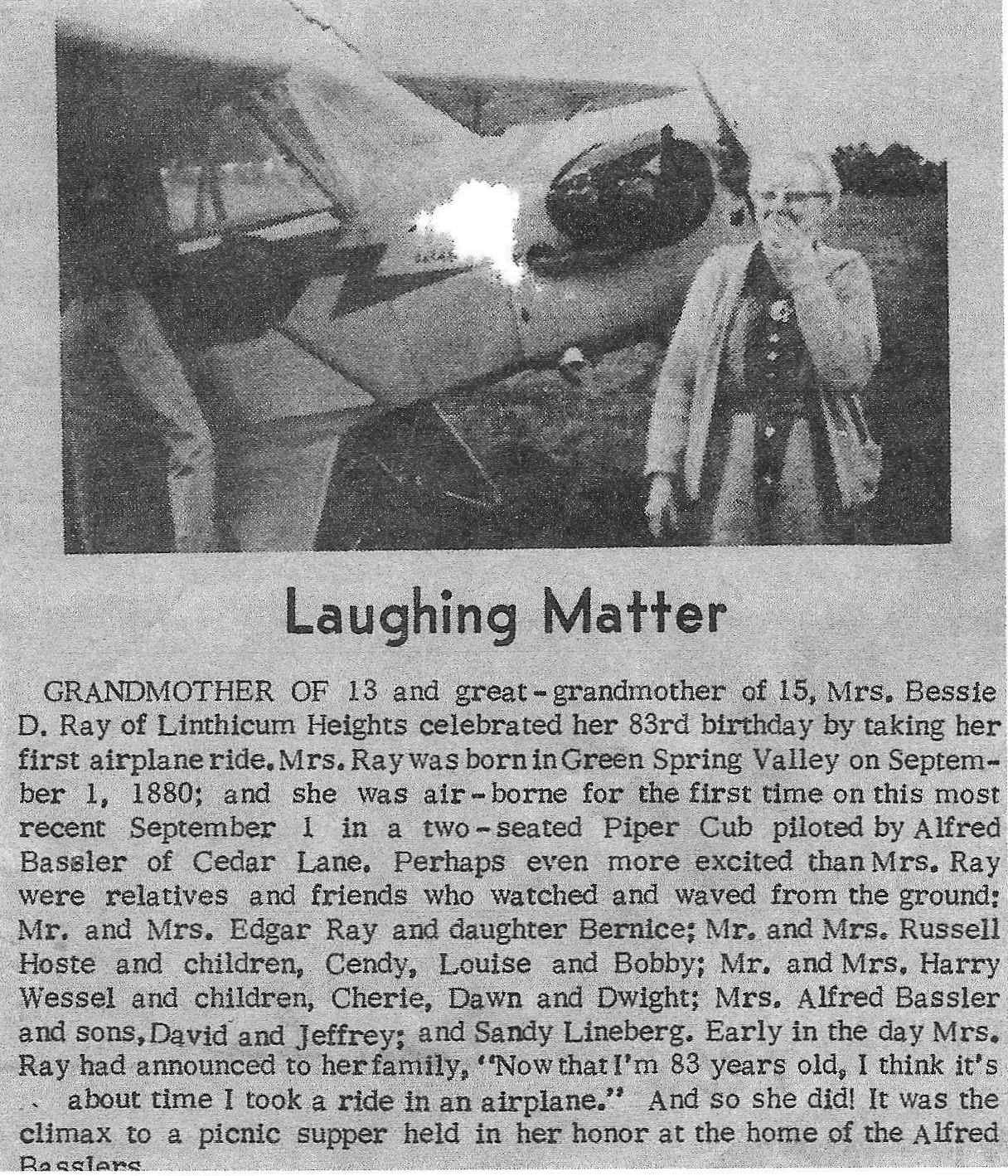 A 1963 article describing Bessie Ray celebrating her 83rd birthday by taking a Piper Cub flight piloted by Alfred Bassler (courtesy of David Suter).