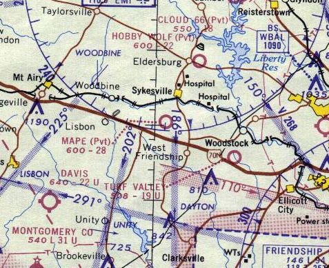 The last aeronautical chart depiction which has been located of Turf Valley Airport was on the March 1967 Washington Sectional Chart.