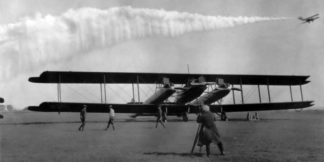 with an Army Martin biplane bomber laying a smokescreen above it.