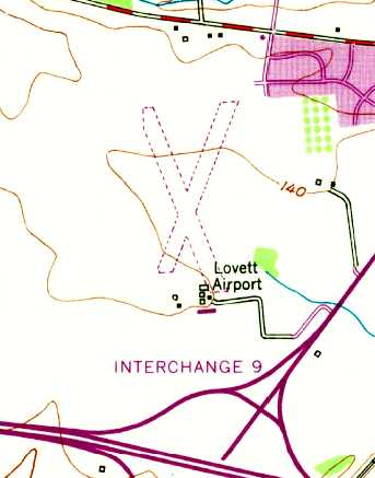 The 1953 USGS topo map depicted Lovett Airport as having 2 unpaved runways, with several buildings on the south side.