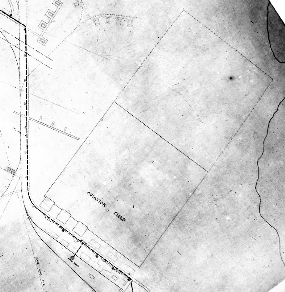 which depicted the “Aviation Field” as a rectangular area with 3 buildings along the southwest side.
