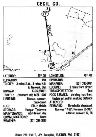 The 1993 Jeppesen Airport Directory depicted the Cecil County Airpark as having a single 2,500' paved Runway 17/35,