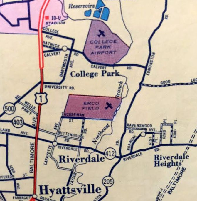 An undated aerial view looking north at ERCO Field (foreground) & College Park Airport (background) from a 1987 article (courtesy of Jim Higgins).