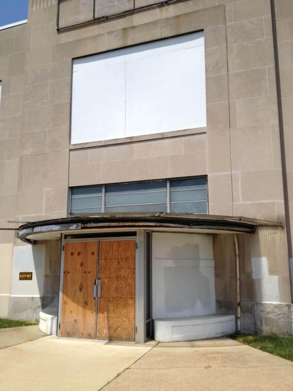 A 7/21/13 photo by Paul Freeman looking northwest at the Erco factory entrance, which has evidently been boarded up at some point between 2006-2013.