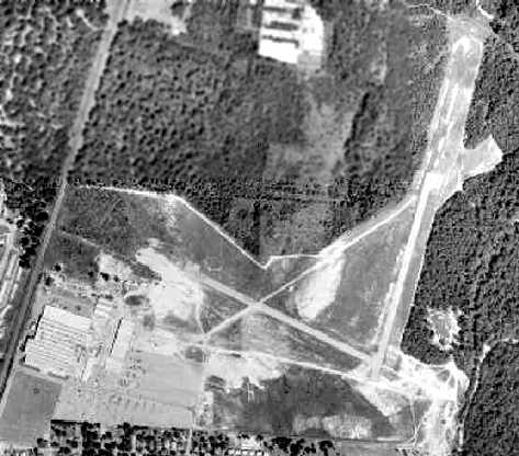 with the northern end of the north/south runway having been bisected by a road, and a baseball diamond having been built over the northern end of the runway.