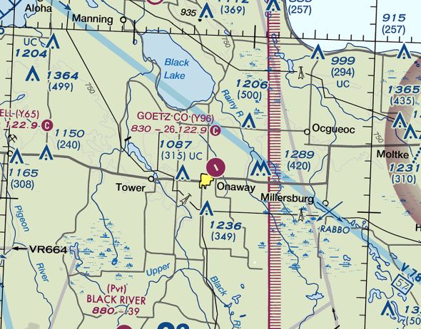The earliest depiction which has been located of Onaway Airport was on the October 1936 Green Bay Sectional Chart.