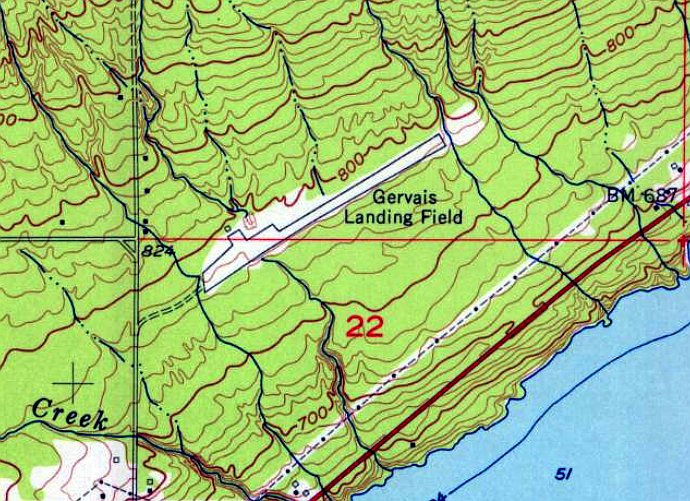 It depicted Gervais Landing Field as having a single northeast/southwest paved runway, with a ramp & a small building on the northwest side.