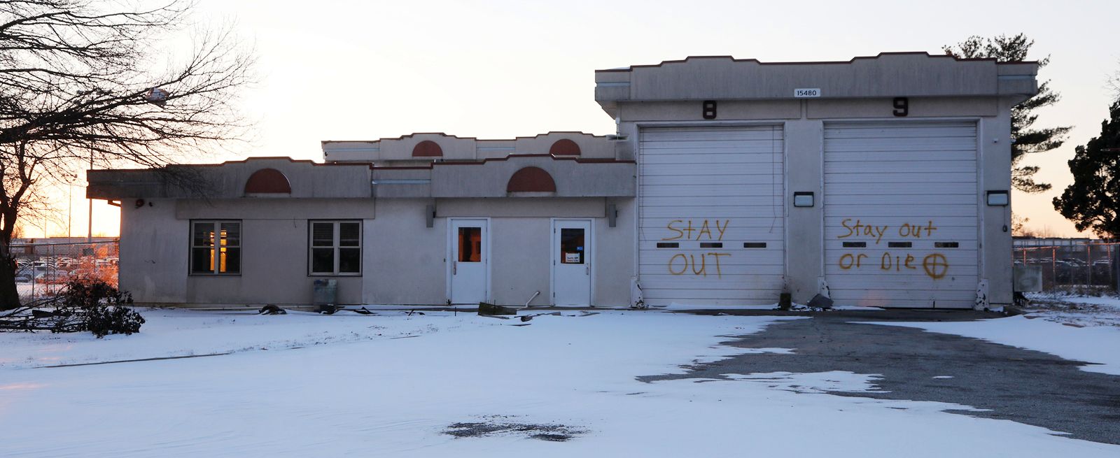 A 3/10/25 photo by David Jaffray of a former Richards-Gebaur AFB fire station, adorned with friendly graffiti.