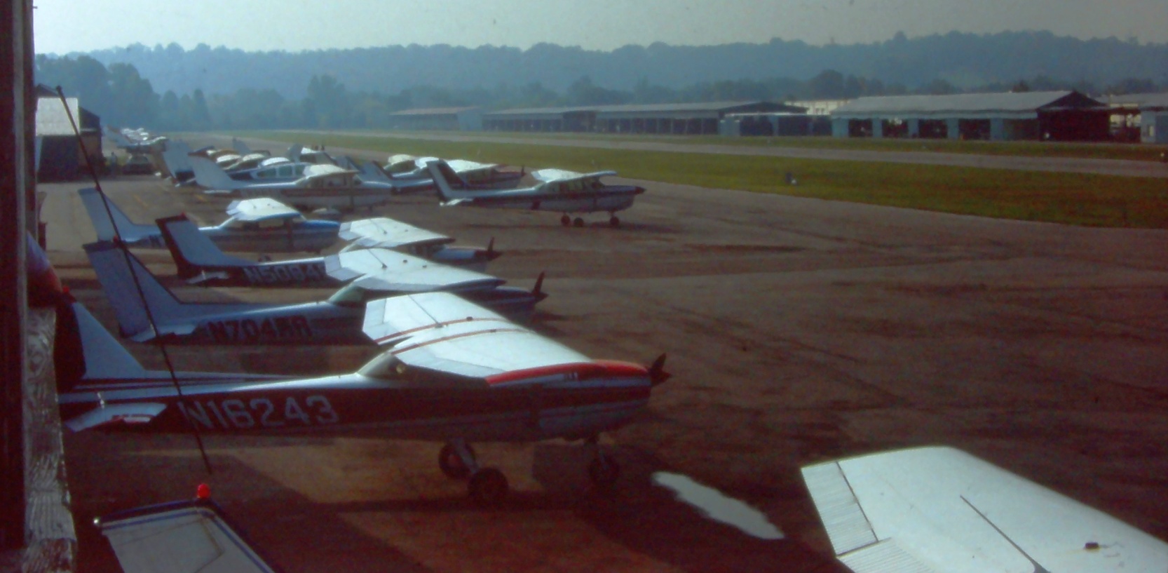 A 1983 photo of a Cessna 152 in front of Weiss Airport's Fixed-Base Operator (courtesy of Jim Naumann).