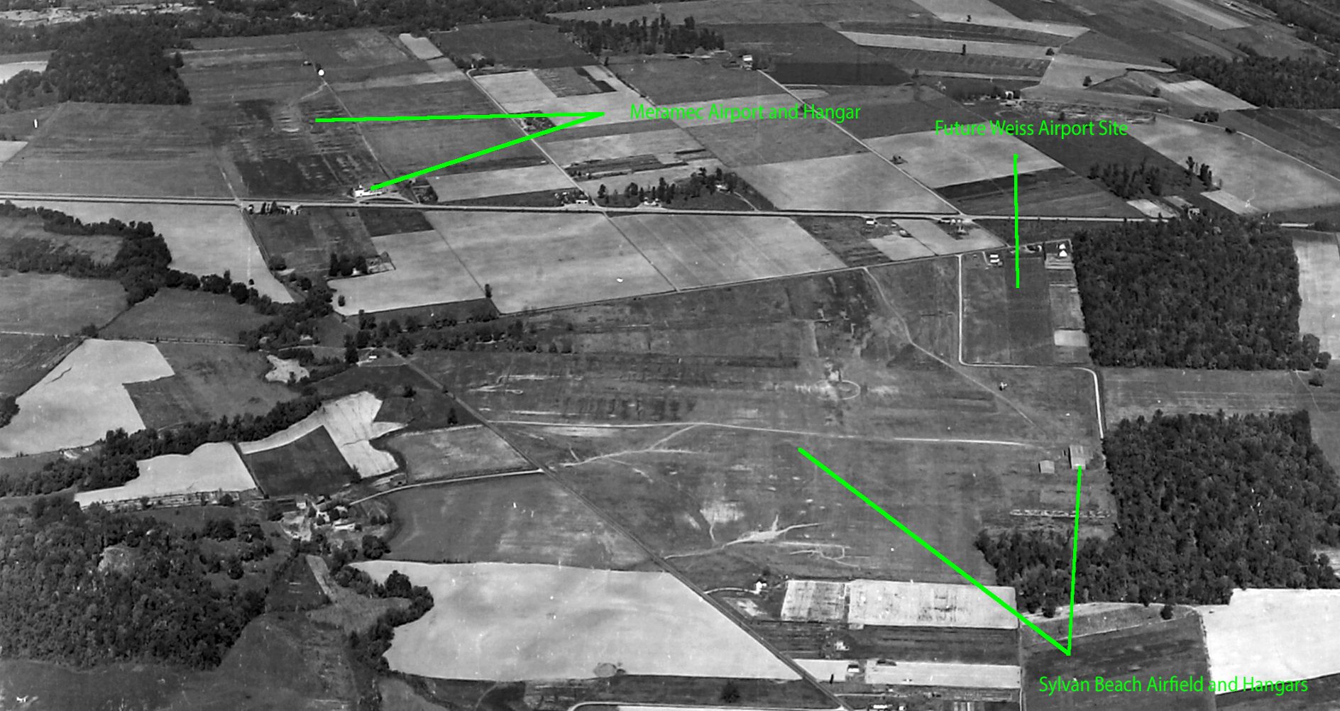 annotated to show the proximity of Meramec Airport, Sylvan Beach Airport, and the eventual Weiss Airport.