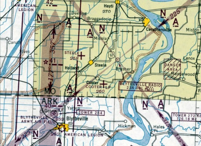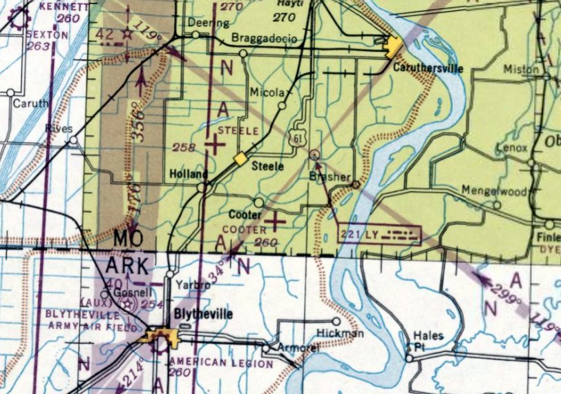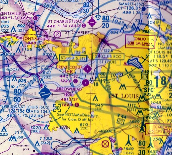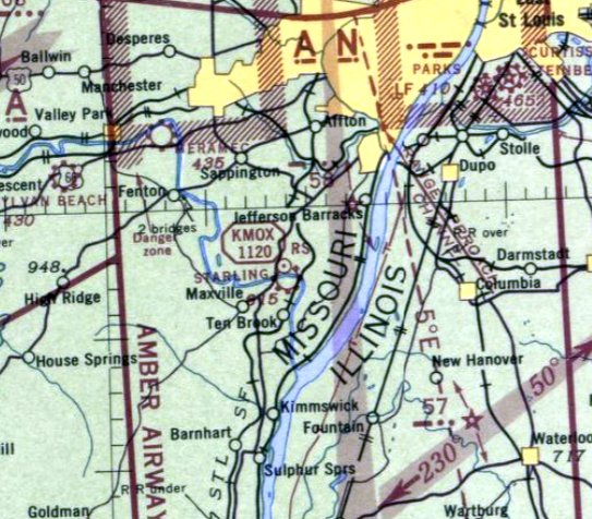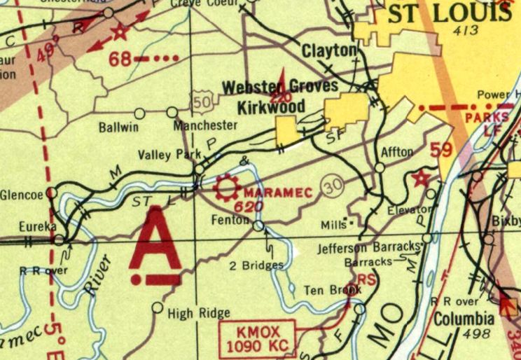 Weiss, Sylvan Beach, and Meramac Airports, all depicted in very close proximity on the 1948 Kansas City Sectional Chart (courtesy of Chris Kennedy).