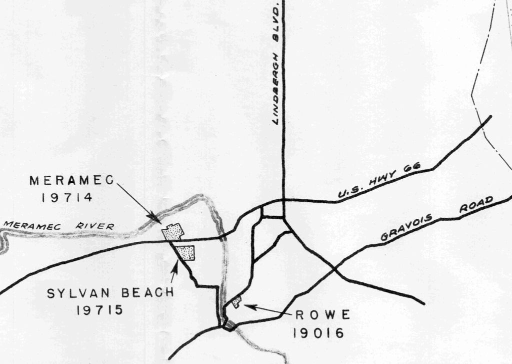 Sylvan Beach, Meramec, and Rowe Fields were shown in close proximity on a 3/2/44 Navy map of NAS St. Louis Outlying Fields (from the National Archives, courtesy of Brian Rehwinkel).