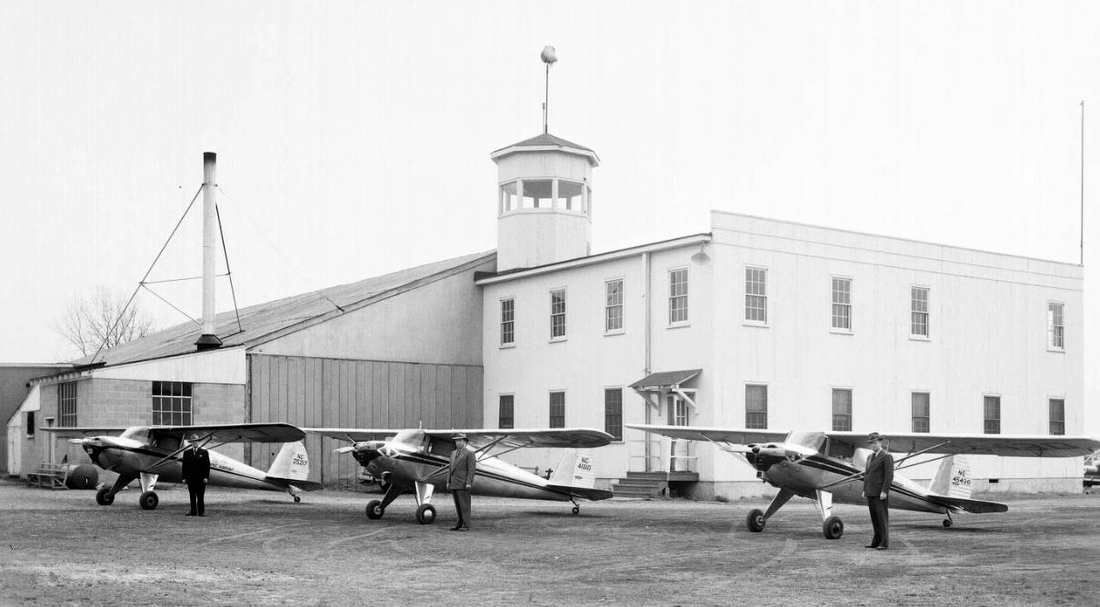 A 3/28/46 photo of 3 Cessna 120s in front of the Meramec Airport hangar & control tower.