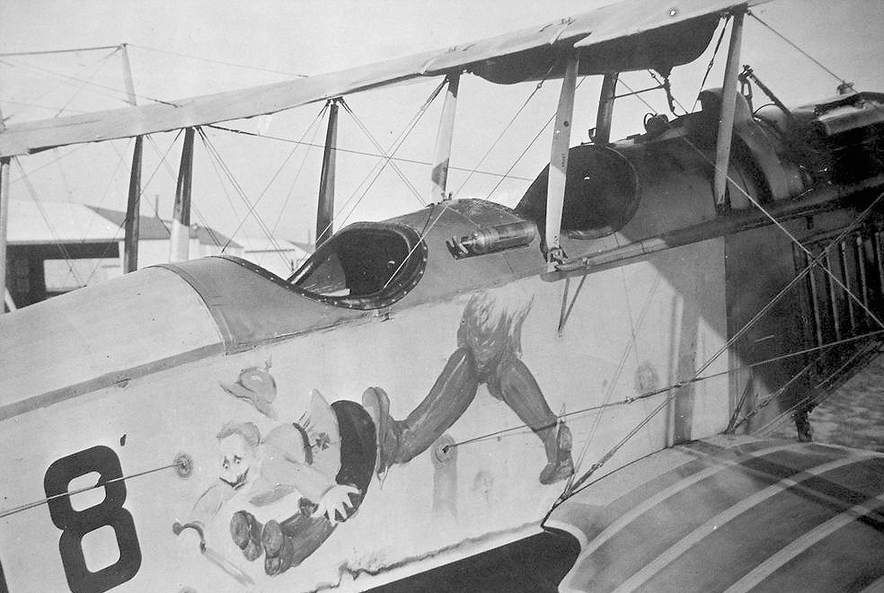 A 1918 US Army photo of fanciful art on the fuselage of a JN-4 training aircraft at Payne Field.