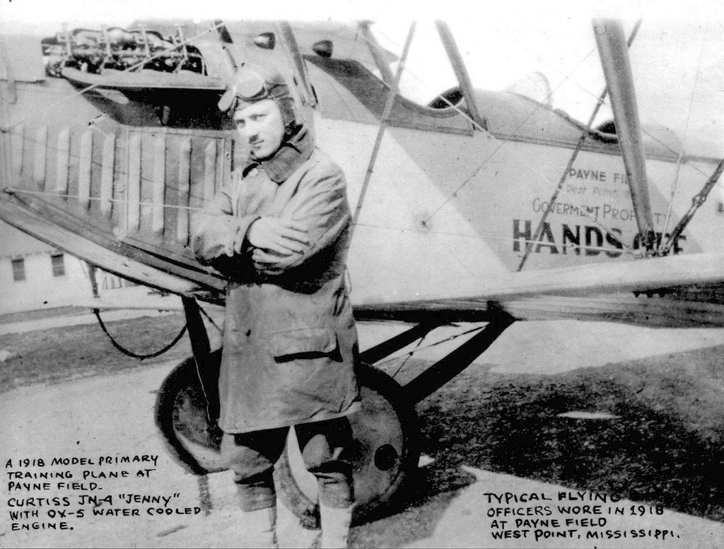 A 1918 US Army photo of a flying instructor in front of a JN-4 training aircraft at Payne Field.