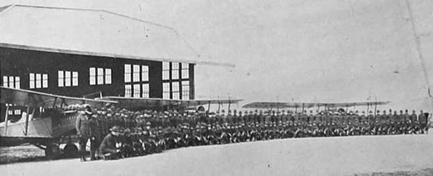 A 1918-20 US Army photo of the men & JN-4 training aircraft of Squadron C in front of a Payne Field hangar.