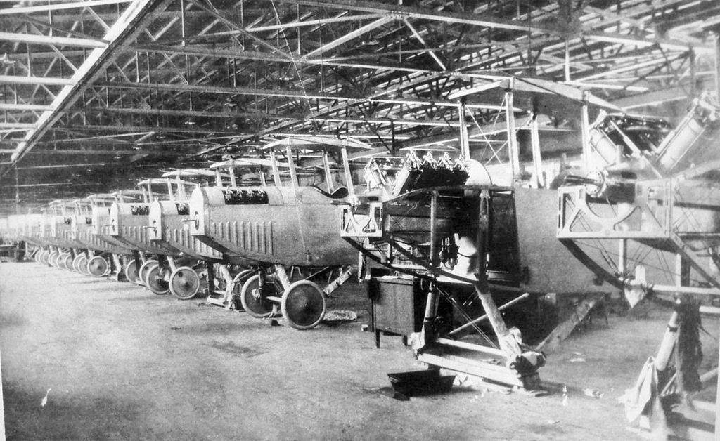 A 1918 US Army photo of the interior of the JN-4 aircraft repair shop at Payne Field.