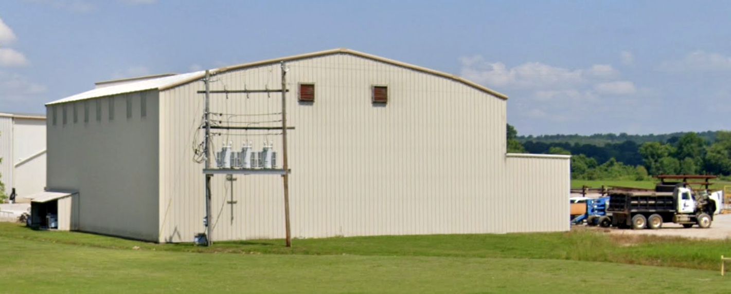 A 2023 photo looking northwest at the modernized 1940s-era hangar which remains standing at the site of Oxford Municipal Airport.