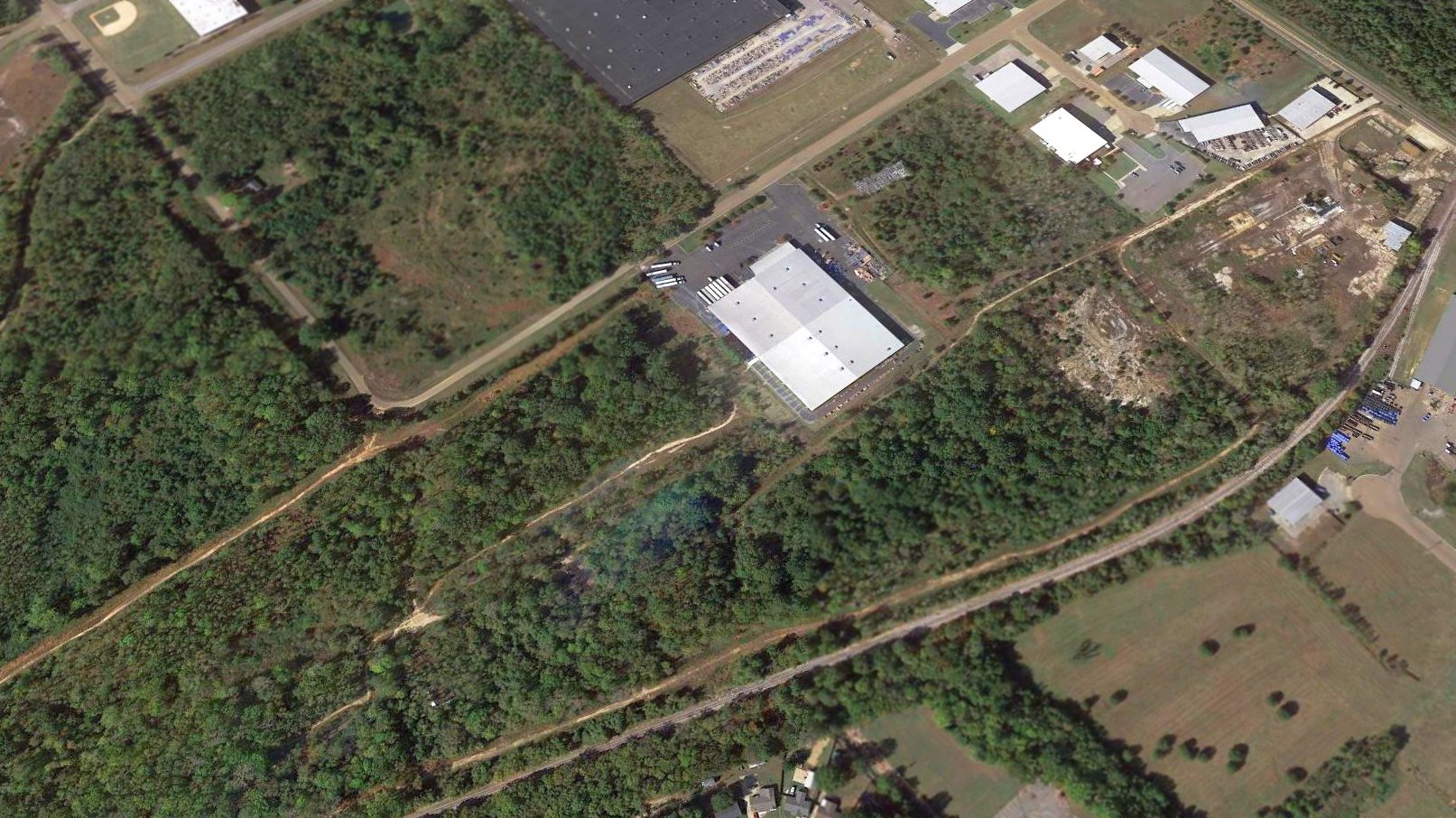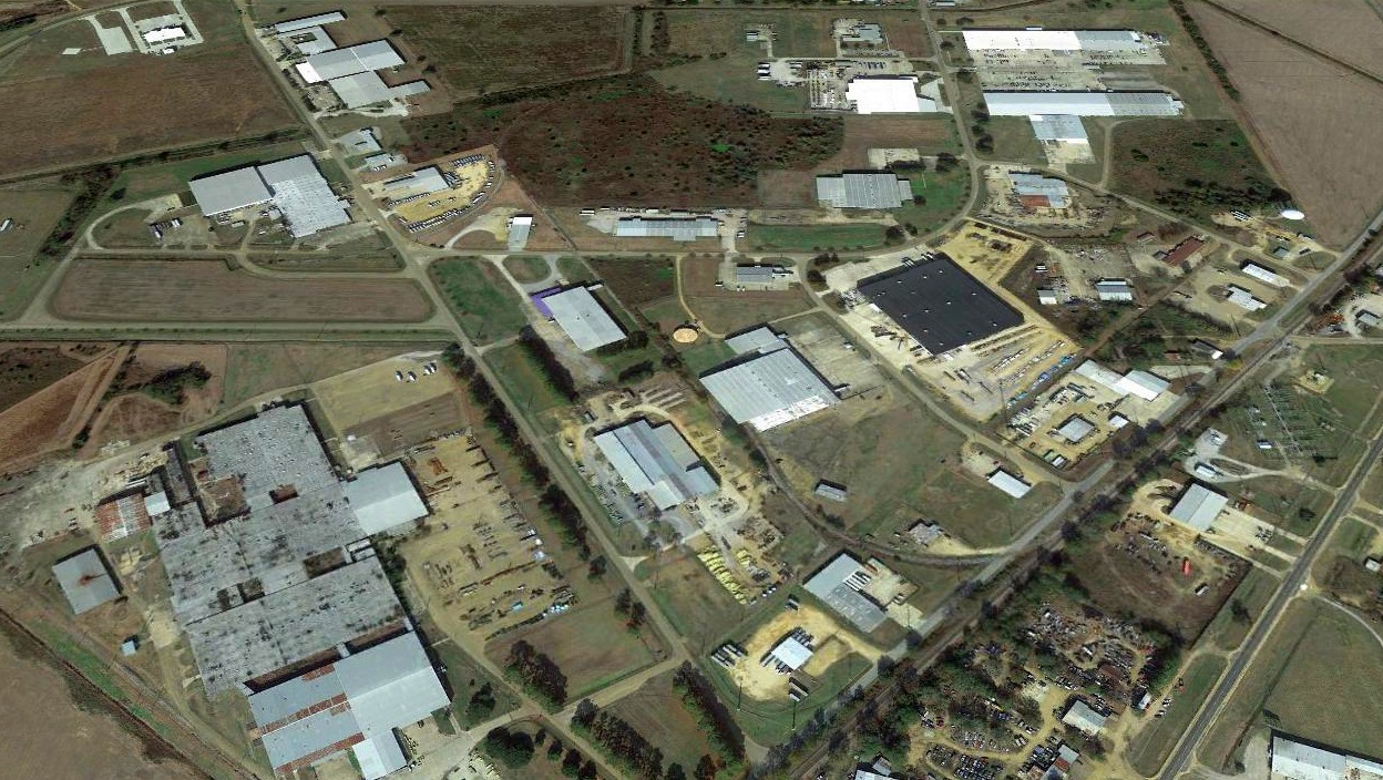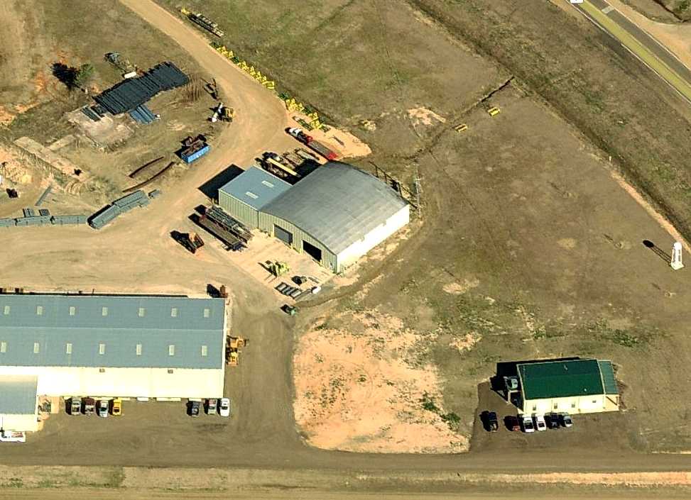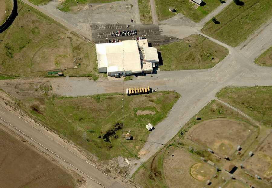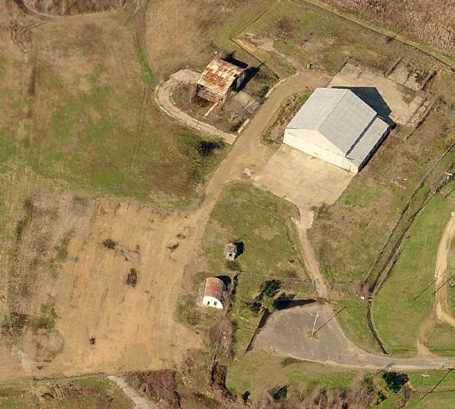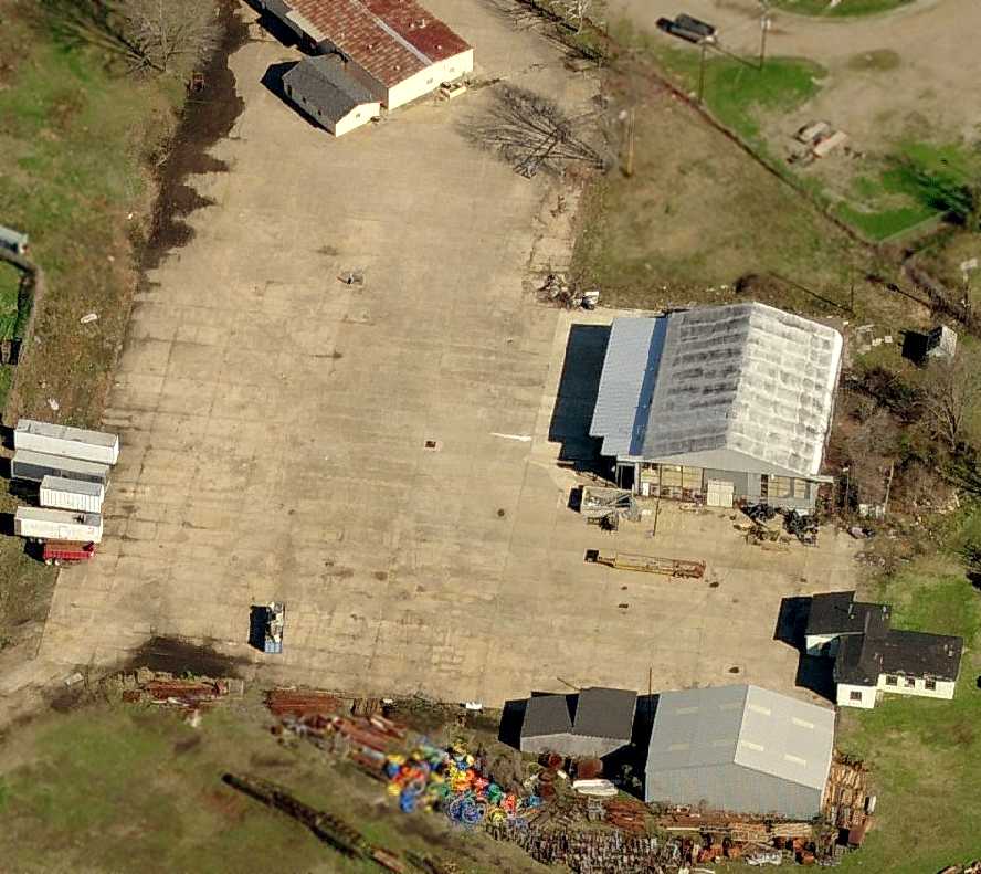 A circa 2006 aerial view looking east at the hangar which remains standing at the site of the original Greenwood Municipal Airport.