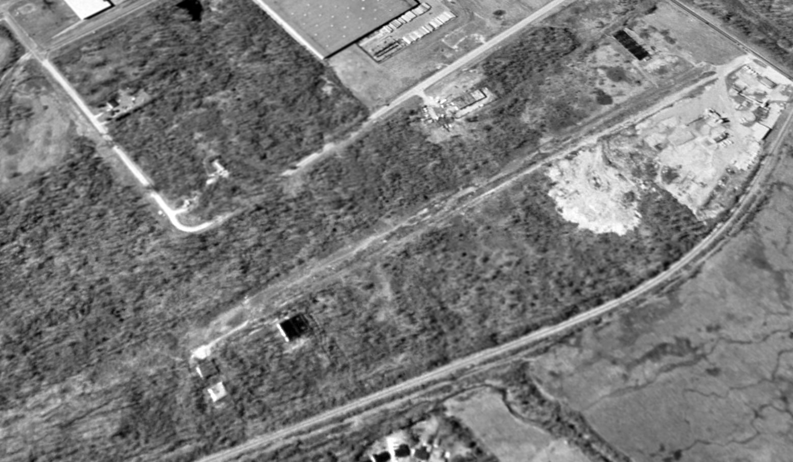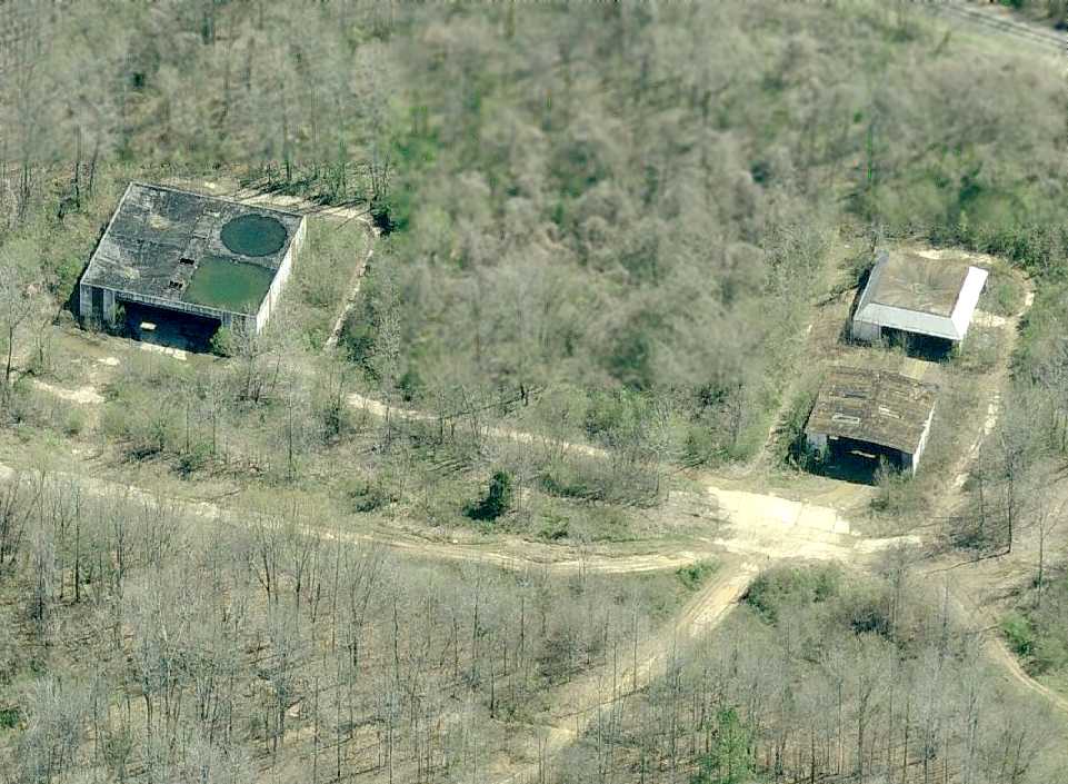 A circa 2006 aerial view looking north at several former hangars which remain standing on the east side of the site of Barrier Airport.