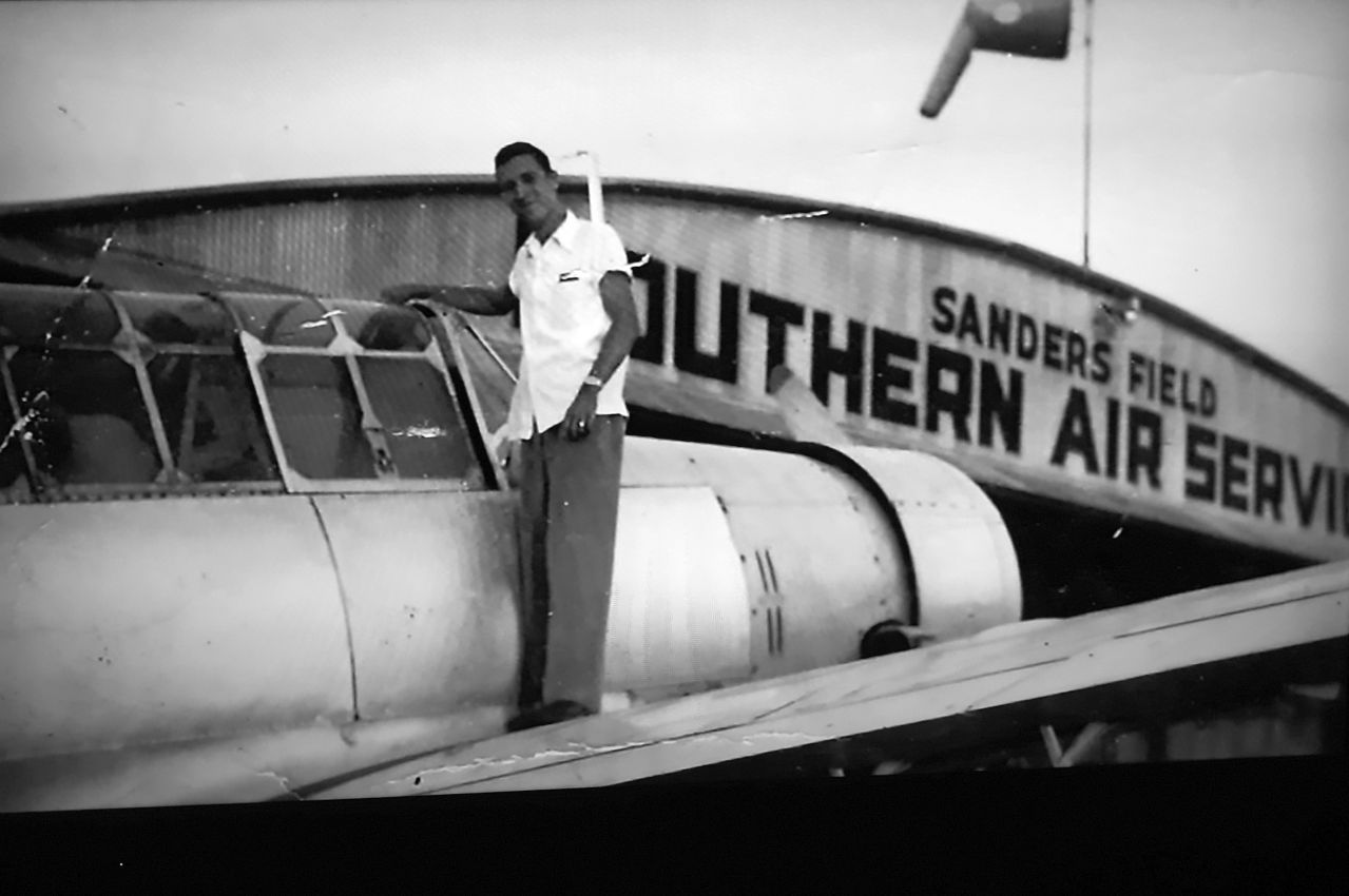 A circa 1950 photo of Creighton Evans & a Vultee BT-13 in front of the Sanders Field Southern Air Services hangar (courtesy of Charlie Evans).