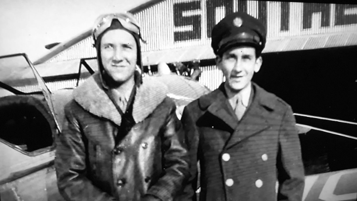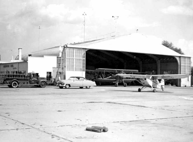 A circa 1950 photo of Creighton Evans & another flight student in front of the Sanders Field Southern Air Services hangar (courtesy of Charlie Evans).