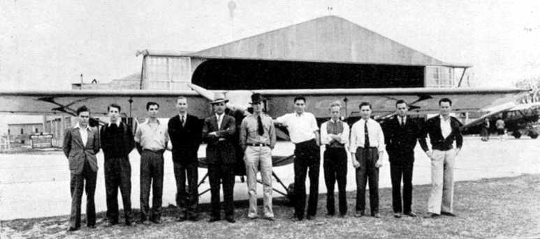 of 3 men in front of a Republic SeaBee amphibian owned by Nickeys Brothers Wood Products of Memphis in front of the Sanders Field Southern Air Services hangar.