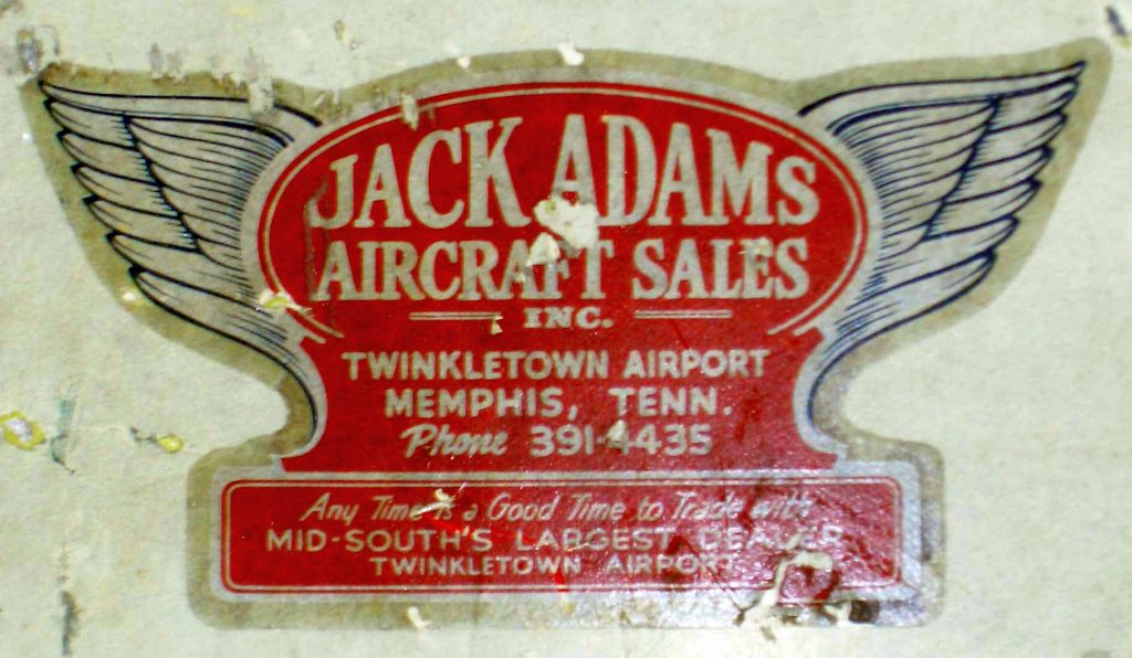 A 2014 photo by Robert Brown of a circa 1950s-70s decal for Jack Adams Aircraft Sales; Twinkletown Airport.