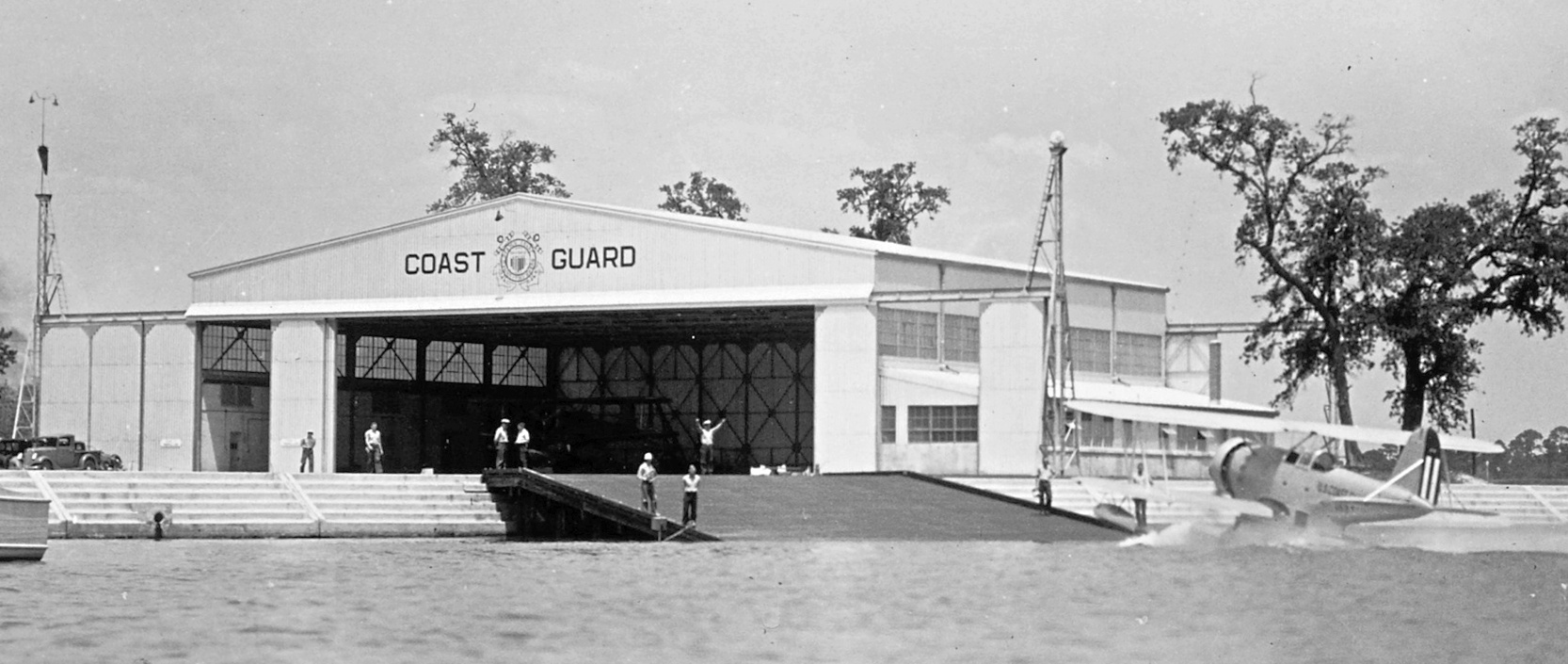 A circa 1936-42 Coast Guard photo (courtesy of David Upton) of a Coast Guard JF2 biplane floatplane coming up the ramp at CGAS Biloxi.
