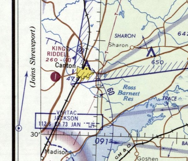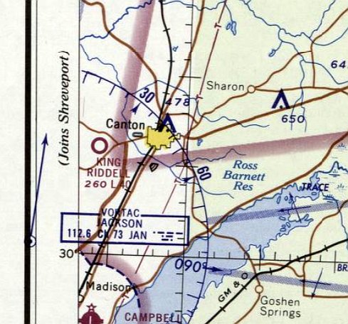 The earliest aeronautical chart depiction which has been located of Jackson County Airport was on the January 1971 New Orleans Sectional Chart (courtesy of Ron Plante).