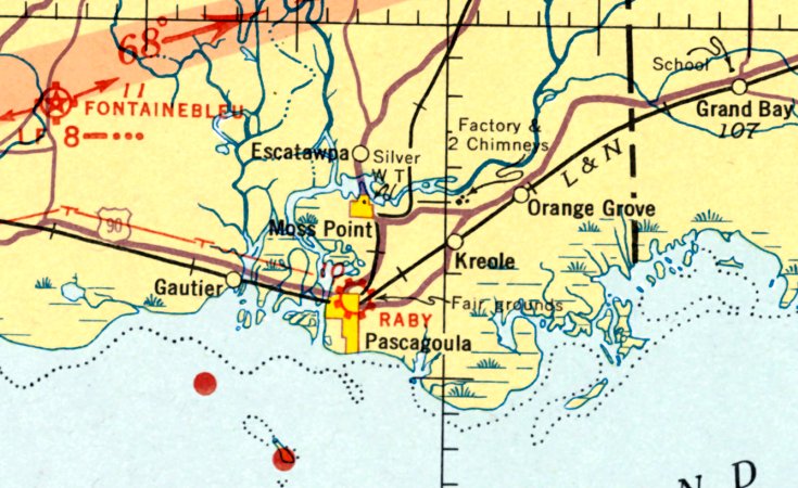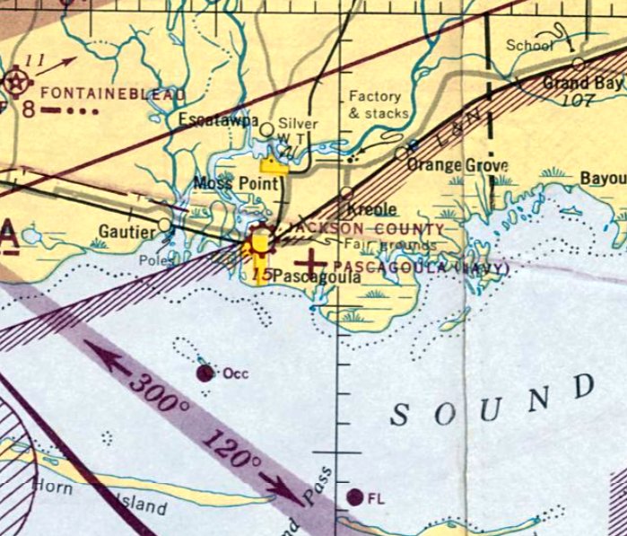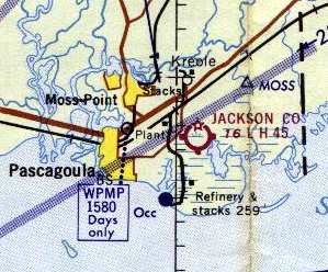 It depicted "Pascagoula (Navy)" as an auxiliary airfield.