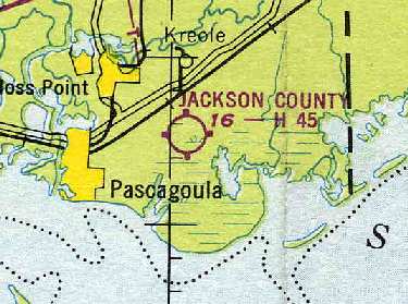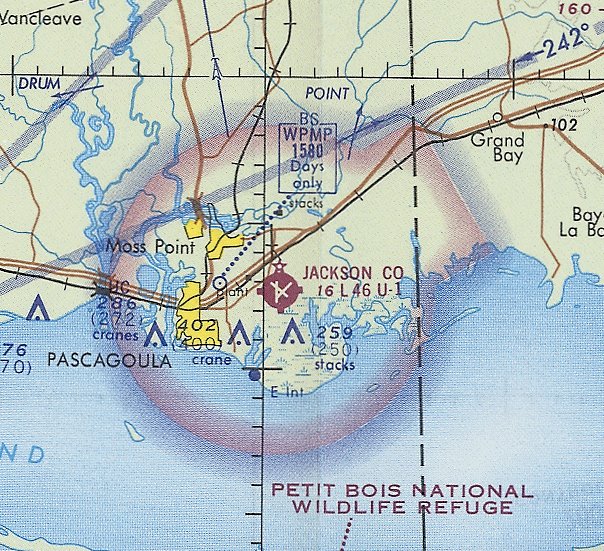The July 1945 Mobile Sectional Chart depicted Jackson County Airport, along with the new Pascagoula Airport which had been built a mile to the east.