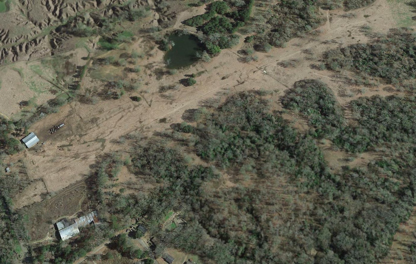 A 2017 aerial view looking southwest shows the hangars & runway of the 2nd location of Picayune Municipal Airport to remain intact.