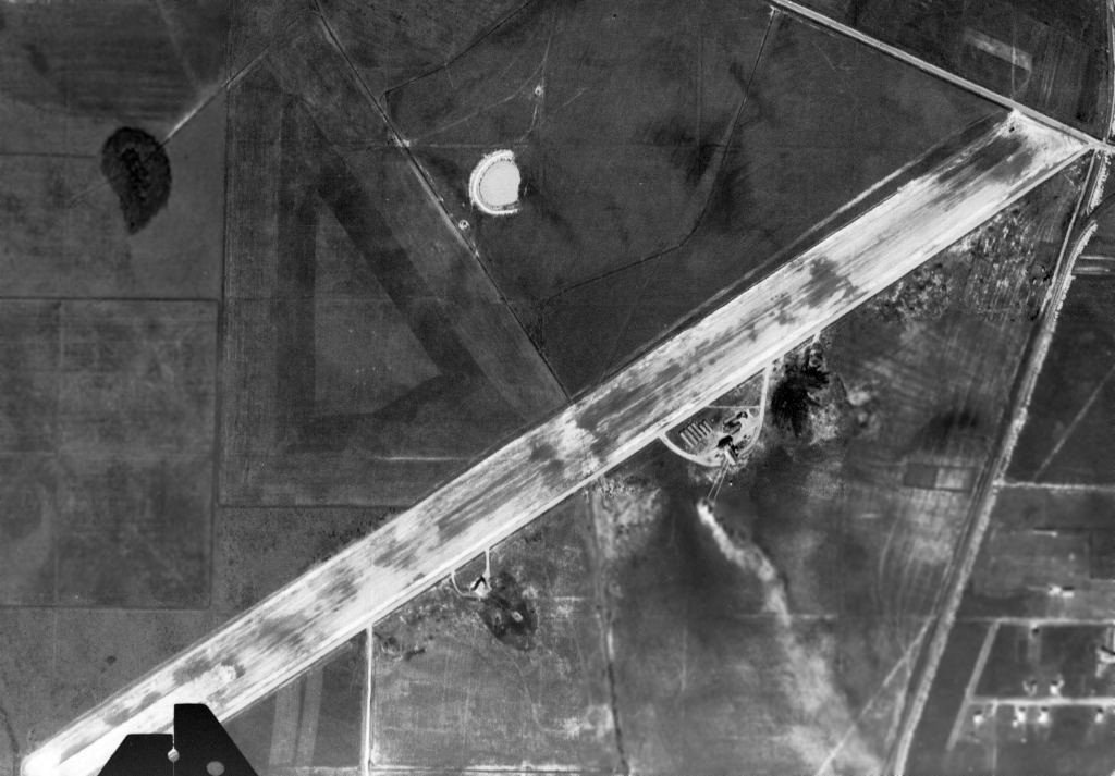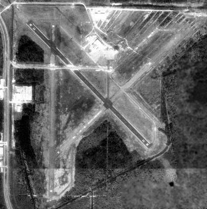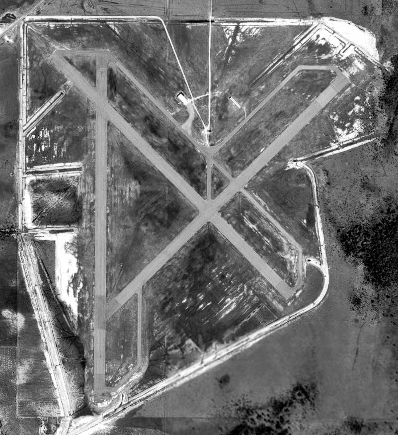 with all 3 runways still largely intact, and several hangars still standing north of the ramp.