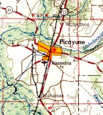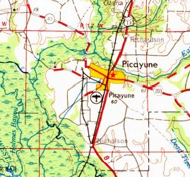 The site of the 2nd location of Picayune Municipal Airport is located southwest of the intersection of Palestine Road & Airport Road.