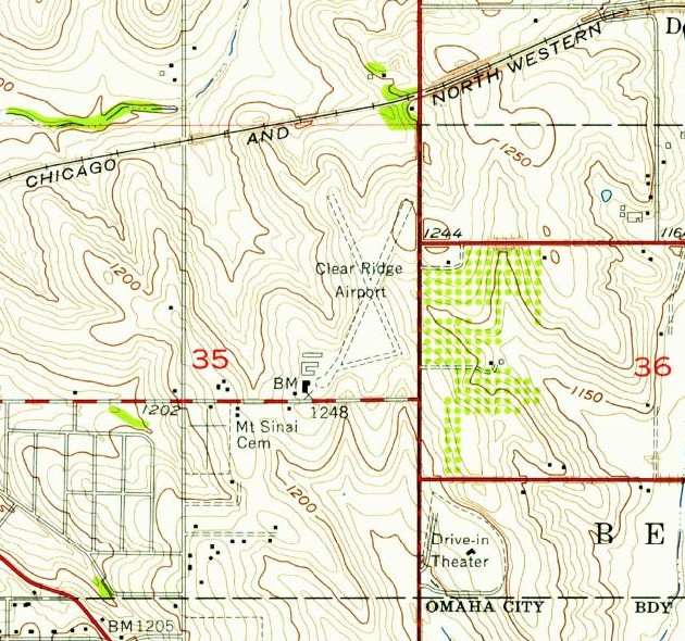 A 1955 aerial photo (from the Omaha-Douglas County GIS, via Mike McDonald) depicted Clear Ridge Airport as having 2 unpaved runways,
