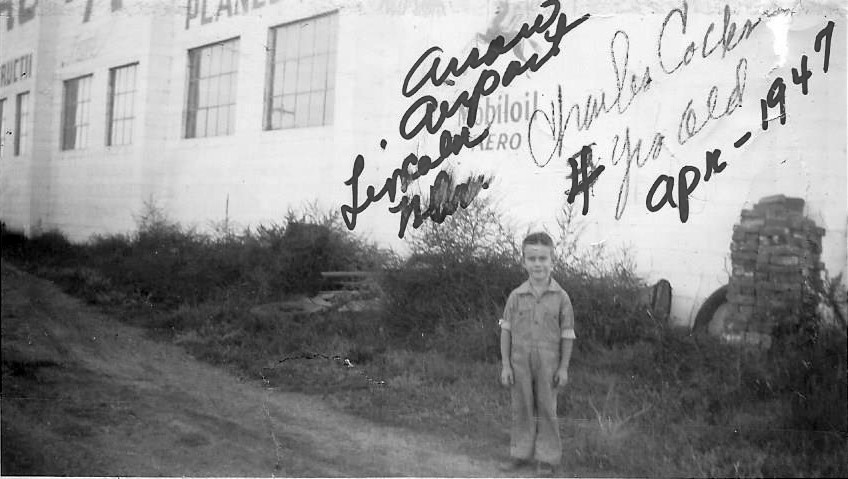 The only ground-level photo which has been located of Arrow Airport was an April 1947 photo of a 4 year old Charles Cocks behind a hangar.