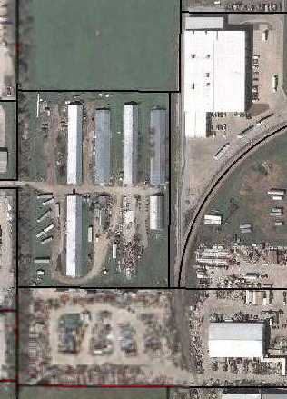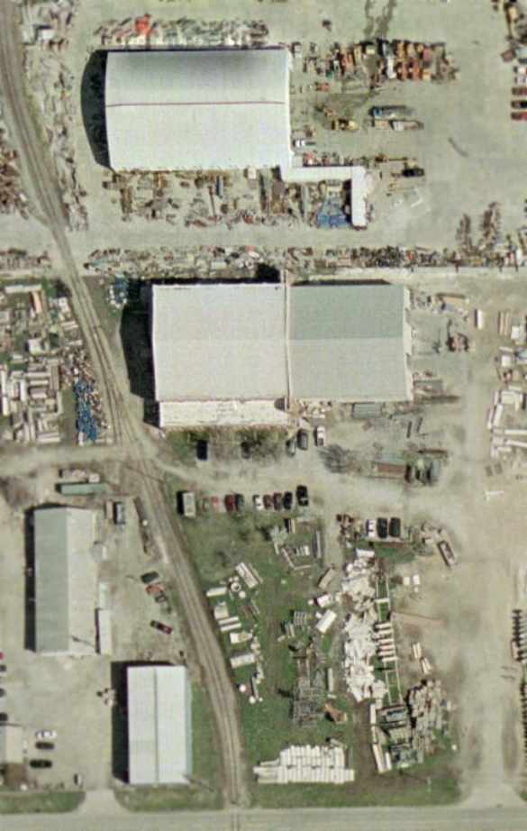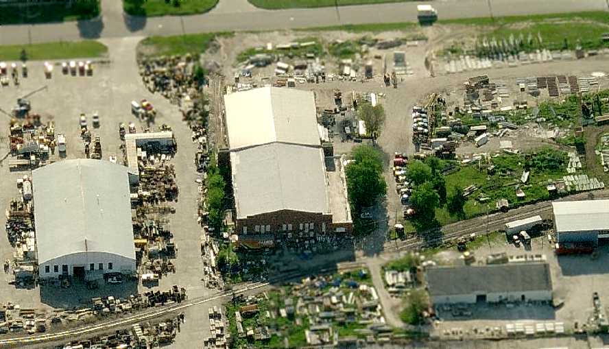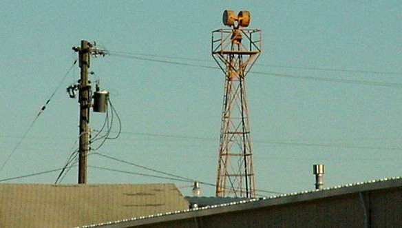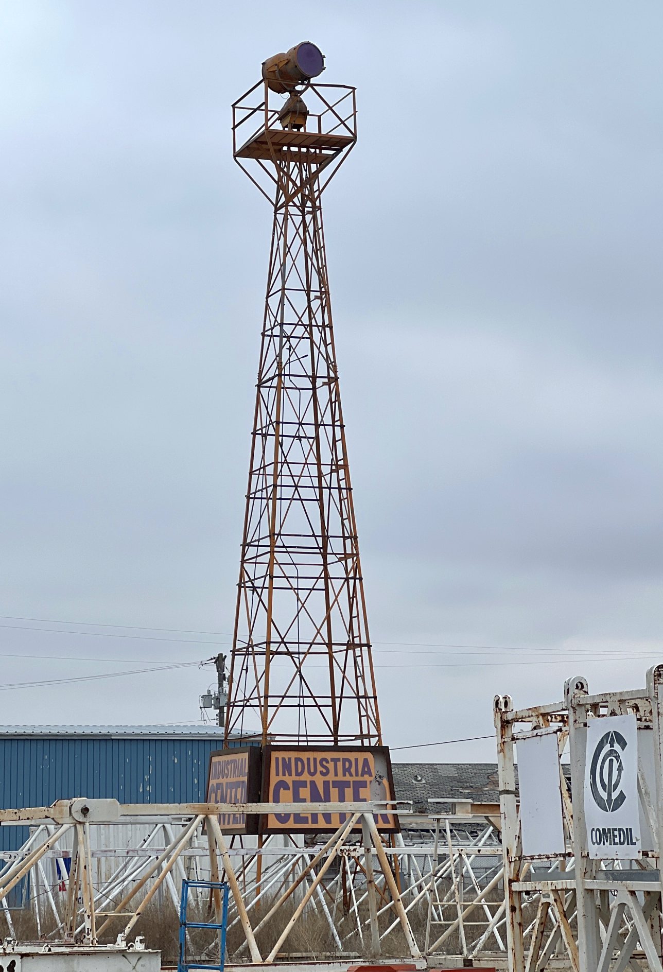 as well as the former airport light beacon tower (right side of photo, barely discernible amongst all of the stored equipment on the property).