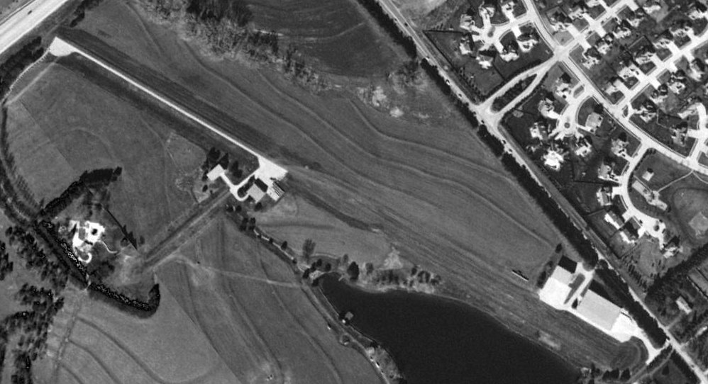 A 1998 aerial photo (courtesy of Matt Feilmeier) showed Weibe Airfield's runway pavement had been removed at some point between 1993-98, probably due to future redevelopment.