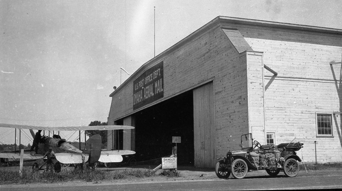 A 1923 photo of an unidentified biplane in front of a hangar marked “U.S. Post Office Dep't. Omaha Aerial Mail” at Aksarben Field (Mike McDonald).