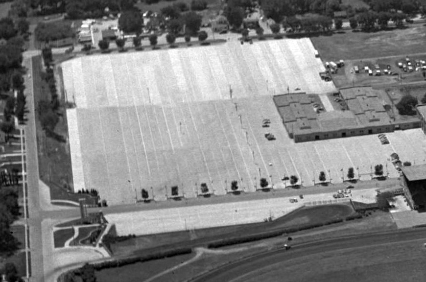 A circa late 1950s aerial view looking southwest at the site of Ak-Sar-Ben Field, paved over as a parking lot (Mike McDonald).