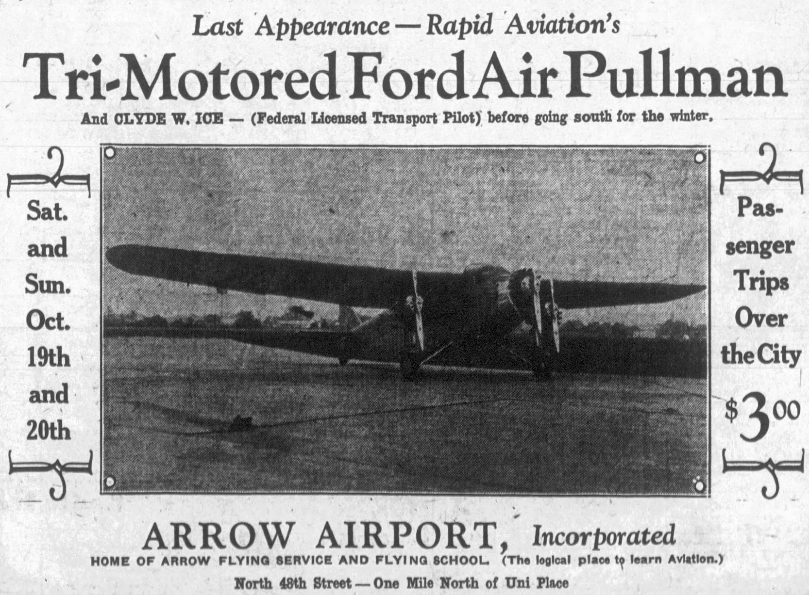 An advertisement for an appearance by a “Tri-Motored Ford Air Pullman” at Arrow Airport from the 10/19/29 NE State Journal.