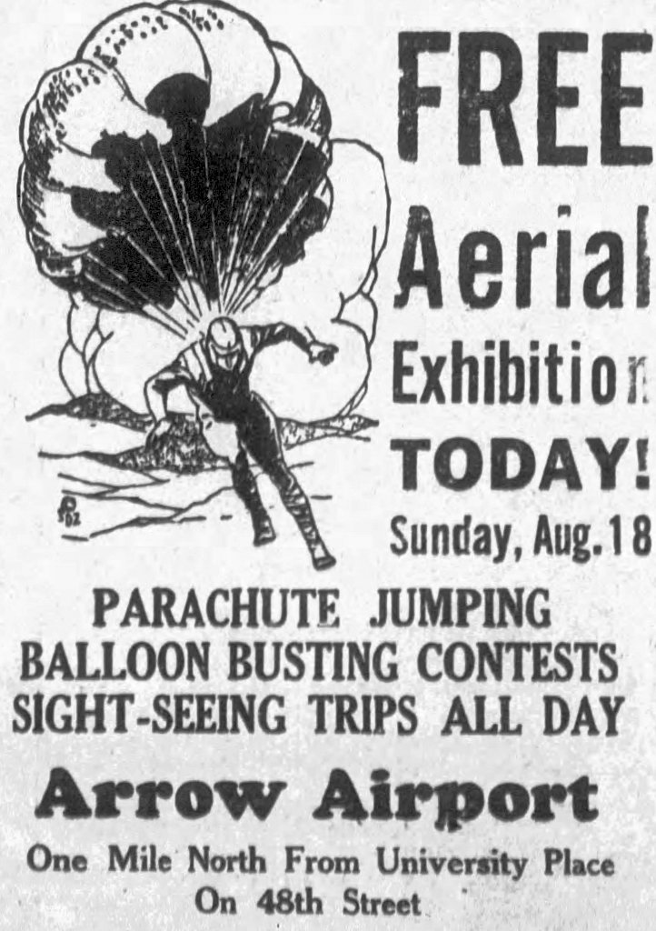 An advertisement for an Aerial Exhibition at Arrow Airport from the 8/18/29 NE State Journal.