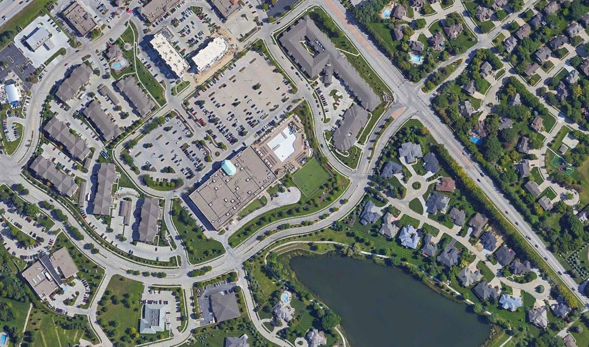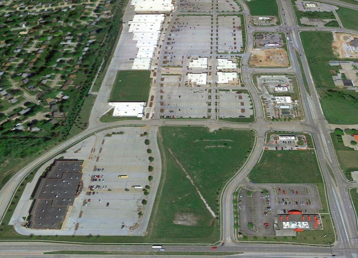 A 2016 aerial view looking north shows no trace remaining of Clear Ridge Airport, with a shopping center covering the airport site.