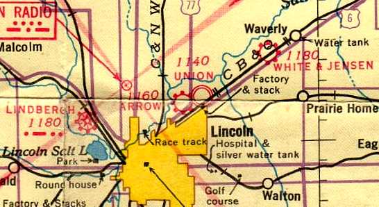 Arrow Airport shown on the northeast corner of a map of airports in the Lincoln area, from a 1929 Department of Commerce Airway Bulletin (courtesy of Steve Green, via Jeff King).