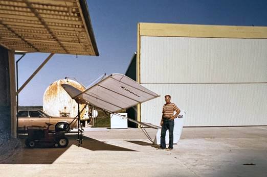 A circa 1977 photo of Carl Brady & an Eipper ultralight in front of the Rogert Airstrip hangars.