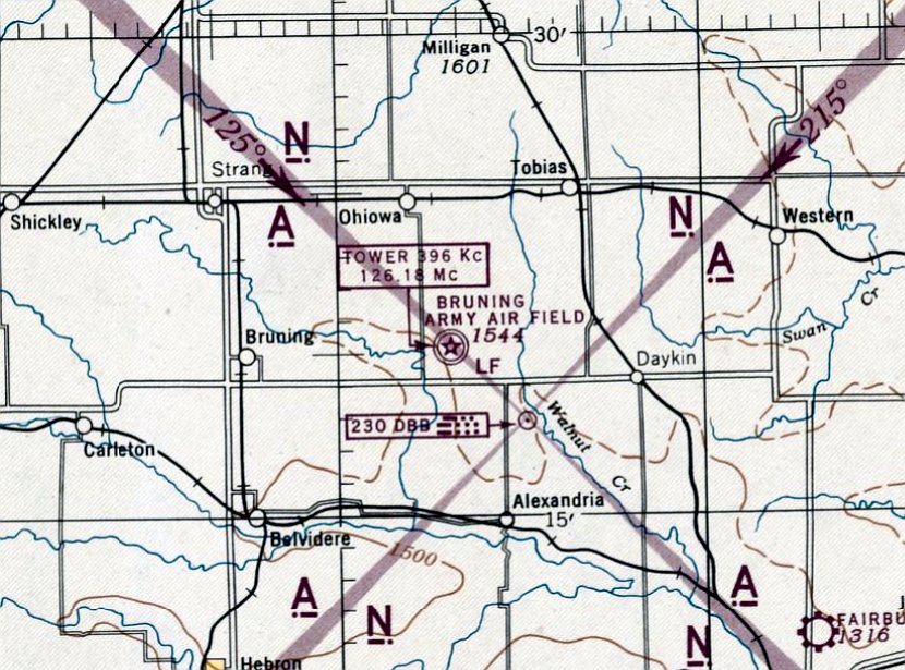 The earliest aeronautical chart depiction which has been located of Bruning AAF was on the March 1944 Lincoln Sectional Chart.