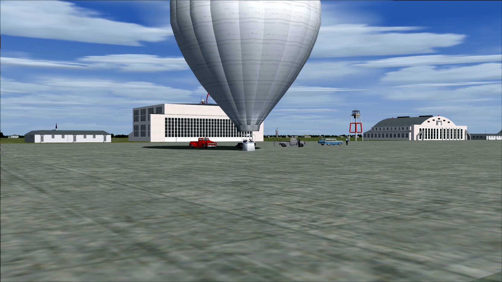 An undated flight simulator depiction of the first hot air balloon flight by Ed Yost at Bruning AAF.